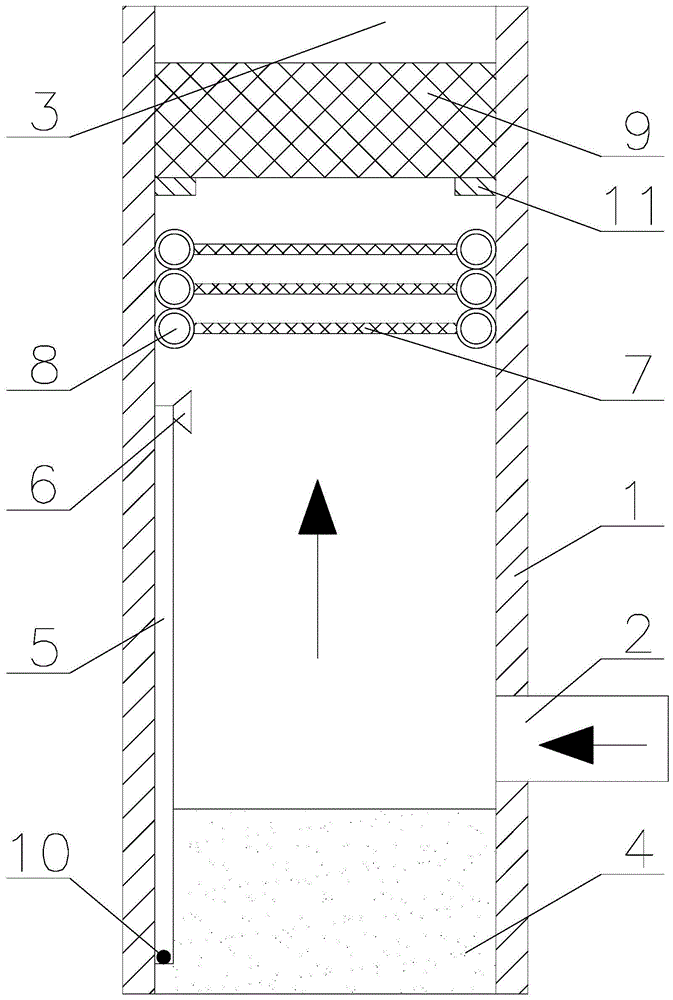 圖中:1、噴淋塔,2、進氣通道,3、出氣口,4、儲水槽,5、水管,6、噴霧頭,7、除霧絲網,8、冷凝管,9、炭箱,9-1、紗布,10、鐵球,11、限位塊。
